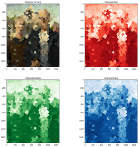 K-nearest neighbor in this case is straightforward, with K=1 transforms the picture in a mosaic (a Voronoi diagram based on the sampled points):